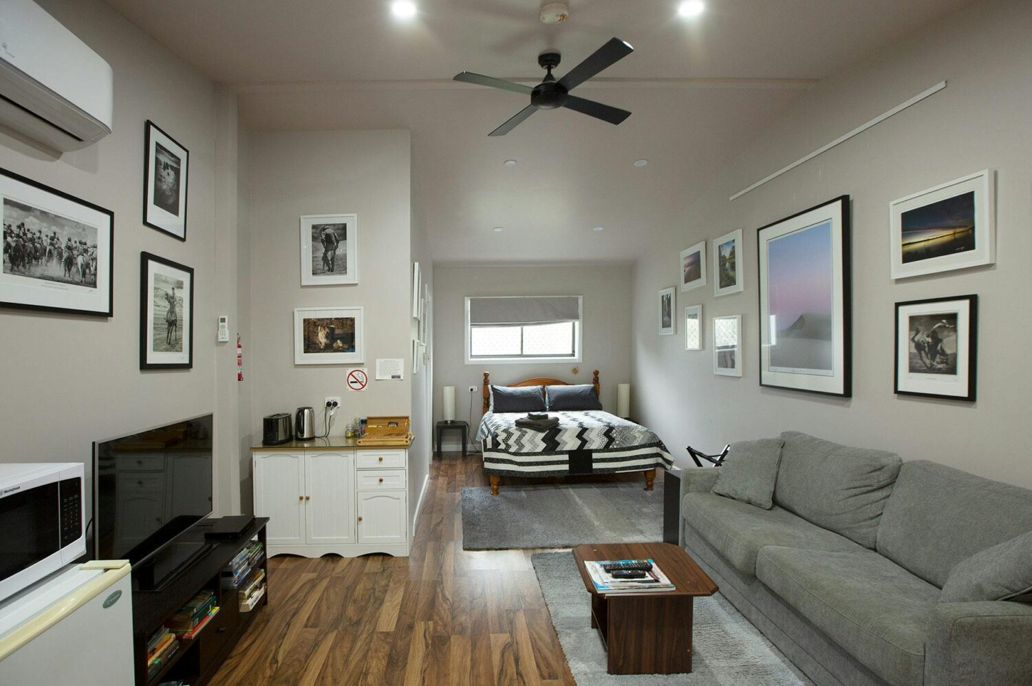 This modern studio-style accommodation is located adjacent to the main house on a six-acre property, just 2.2 kilometres from Tumbarumba, a town in the Snowy Valley Region of New South Wales. This beautiful region is surrounded by stunning rural scenery and is an hour’s drive south from Tumut. The Pound Creek Gallery is also located 2.2 kilometres from the Tumbarumba township and is set amongst rural properties, making it a peaceful and quiet place to stay. Popular nearby landmarks include Paddy’s River Falls, Mannus Lake, Paddy’s River Dam, and the Tumbarumba Rail Trail Cycleway entry, which is only three kilometres away.